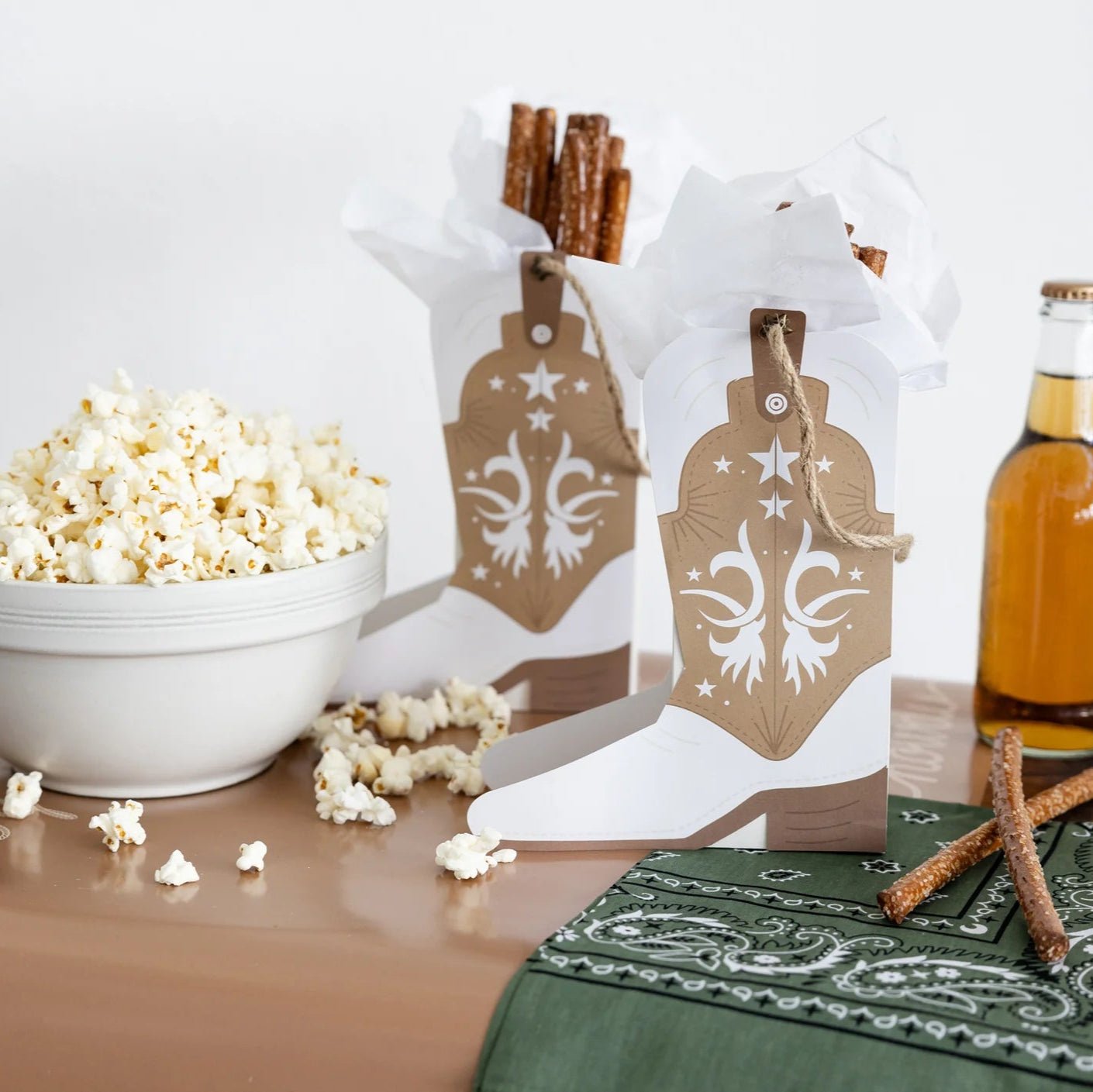 Each box is detailed with a classic cowboy boot silhouette and features a sturdy jute rope handle, adding a rustic, down-home touch your guests will love. Whether you’re hosting a rodeo birthday, a cowgirl baby shower, or a country hoedown, these favor boxes will have your guests boot-scootin’ out the door with smiles and goodies in hand.