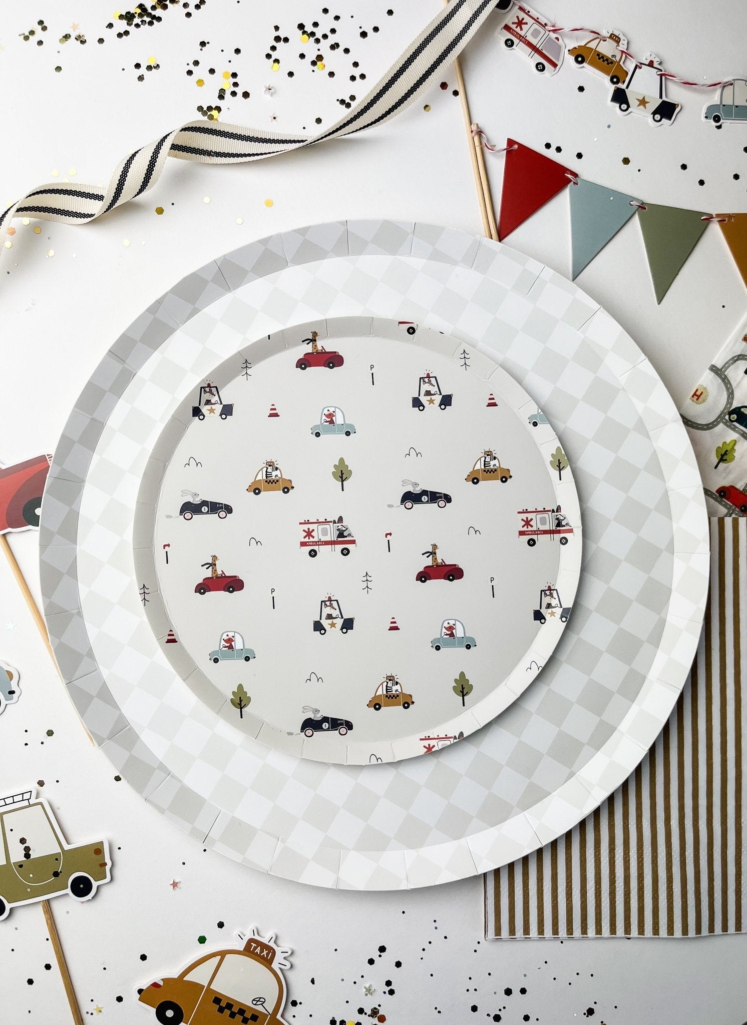 Car Patterned Birthday Dessert Plates – 7" Beige Plates (12pcs)