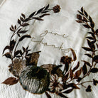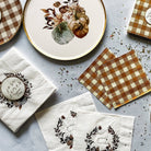 33x33 cremefarbene Kürbis-Dinnerservietten mit Goldfolien-Schriftzug „Give Thank“.