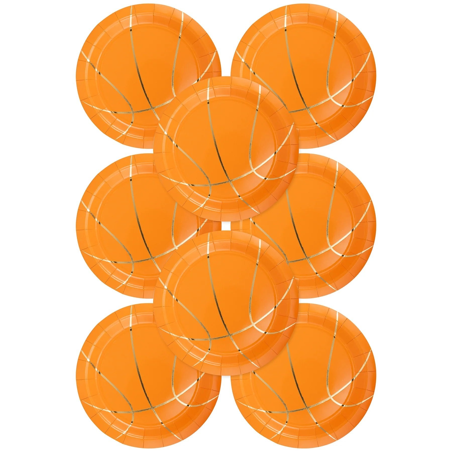 9" basketball-shaped plates with gold foil — perfect for game day parties, sports birthdays, and team celebrations. Set of 8.