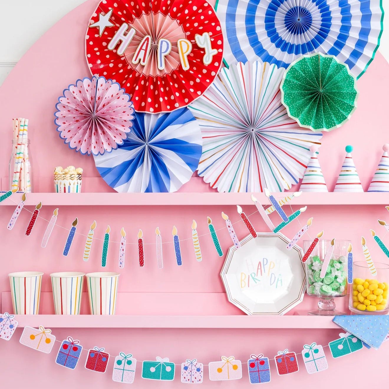 Each banner measures 5 feet long, with candles standing 4 inches tall and gift icons at 3 inches tall, making them the perfect petite party accent for dessert tables, playrooms, gift stations, or photo backdrops.