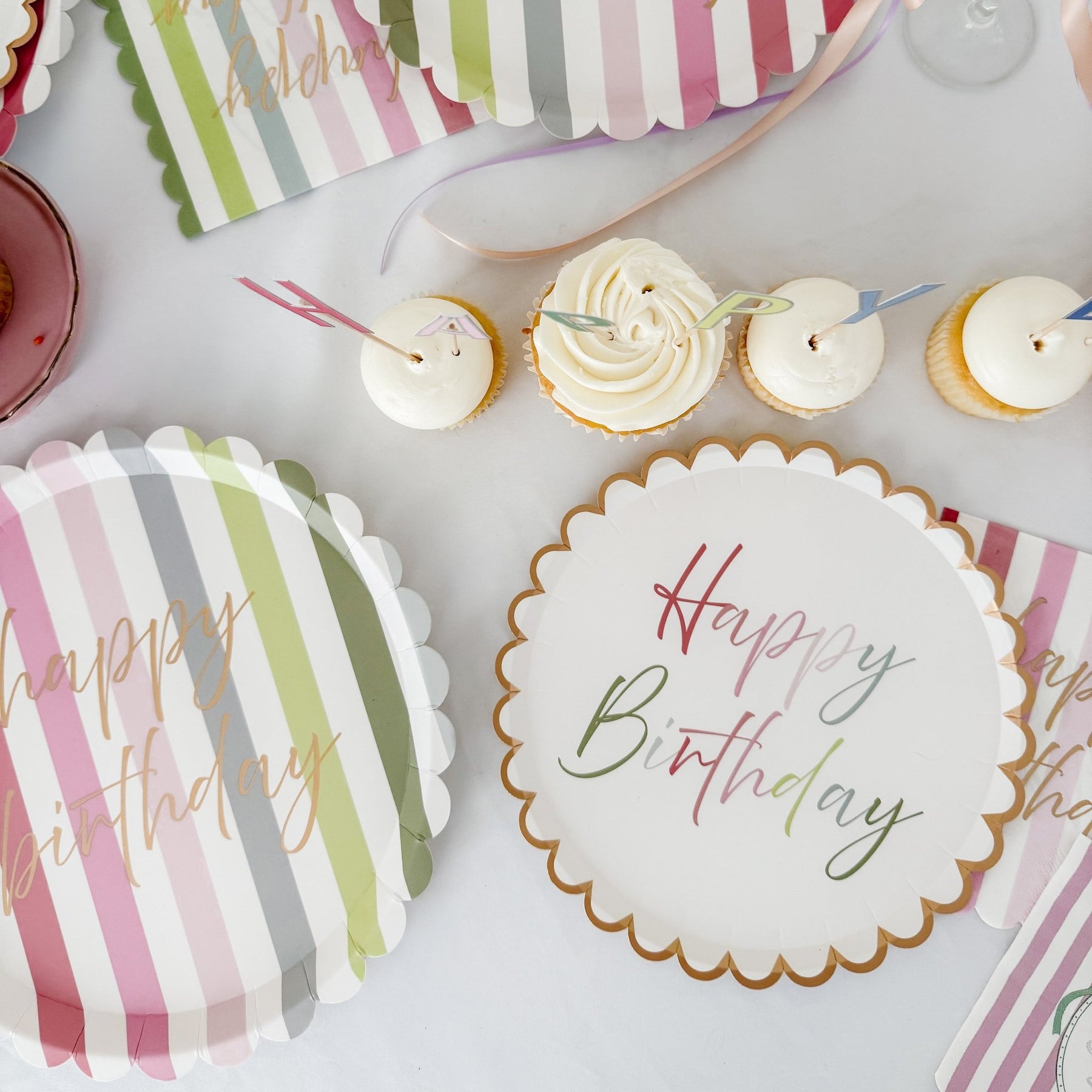 Featuring a clean ivory background and delicate multicolor script reading “Happy Birthday,” these plates are finished with a metallic gold scalloped rim for a refined, boutique-inspired touch. The subtle mix of blush, sage, soft gray, and muted pink tones makes this design both playful and sophisticated.
