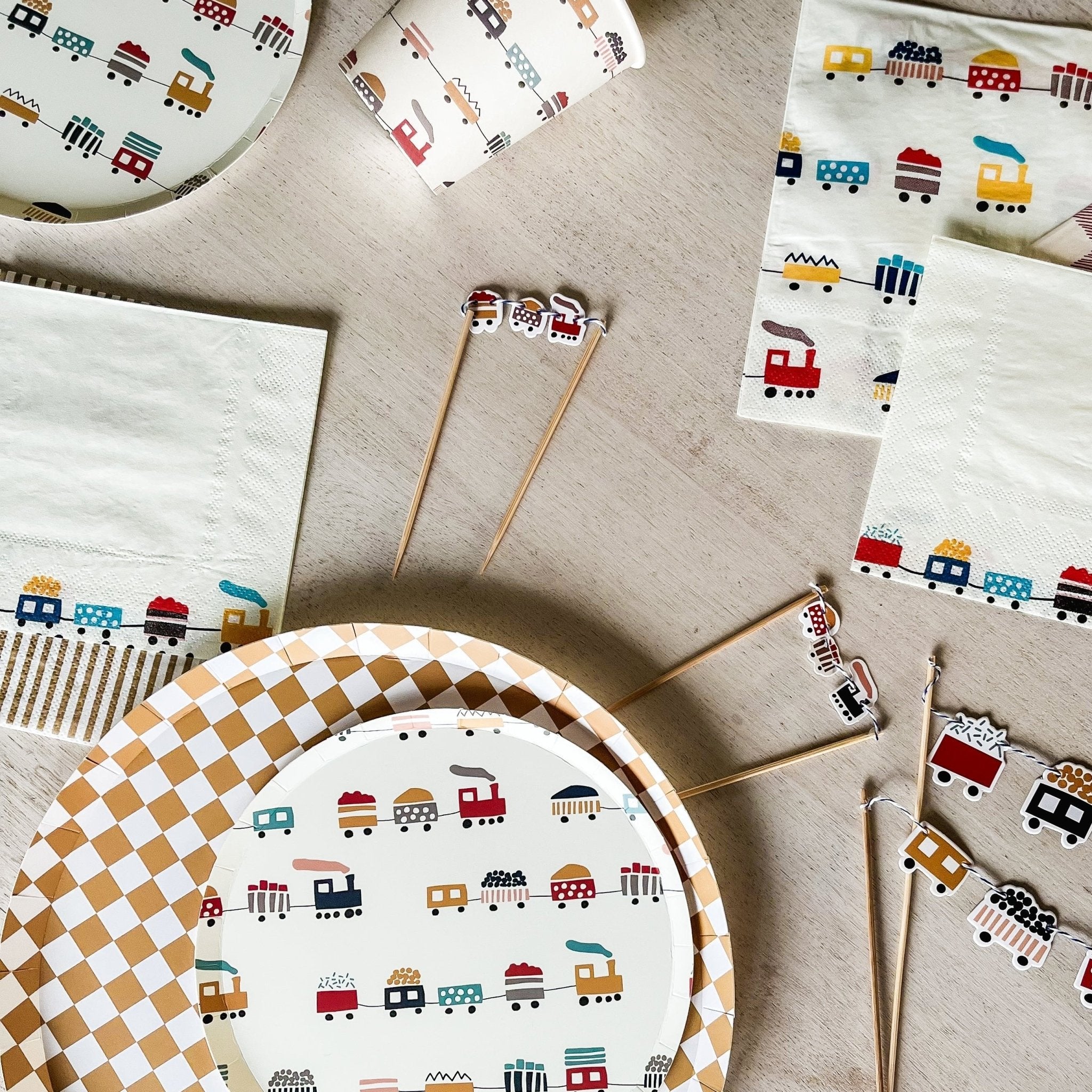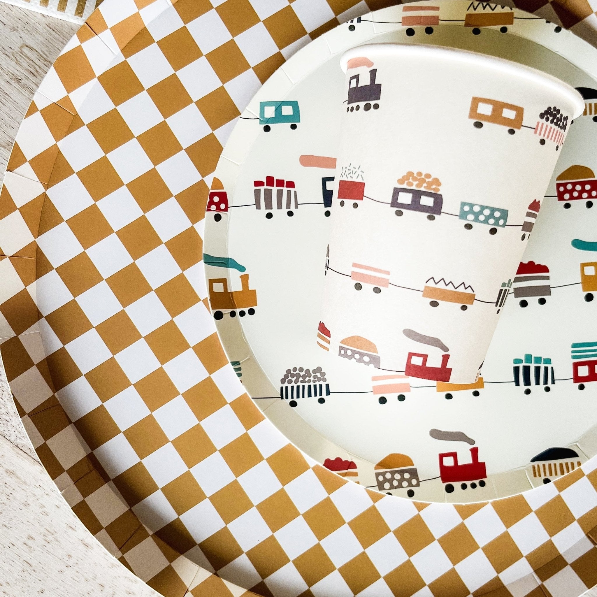 Perfect set of 8 train patterned cups for your Chugga Chugga Choo Choo party. White 9 oz paper cups with train and railroad pattern. Red, teal, mustard yellow, black, navy & beige accents make the sweetest Choo Choo train party cups for your little conductor!