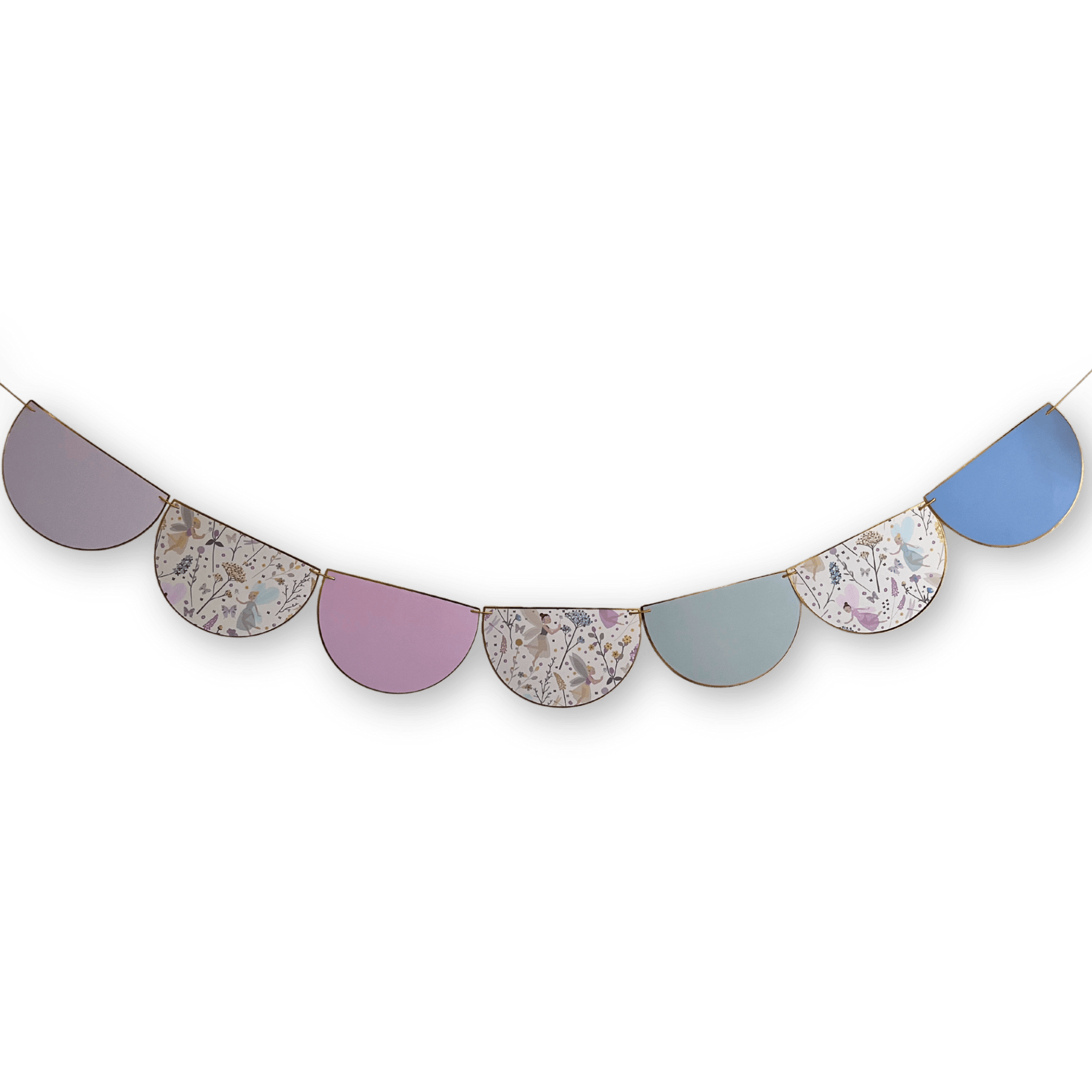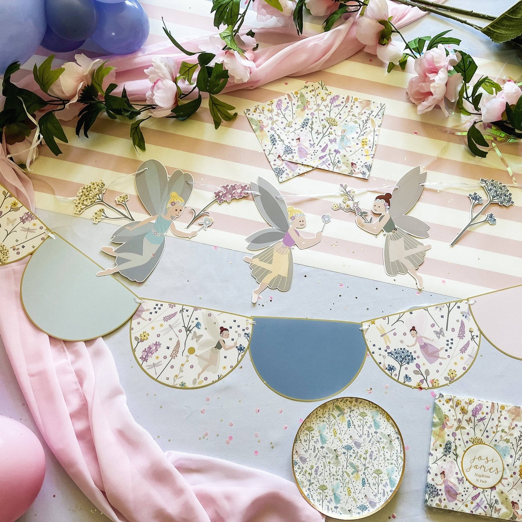 Beautiful pastel scalloped garden fairy banner. Light purple, light pink, light blue and beautiful cornflower blue accents, garden fairy and floral patterns with gold foil trim! An elegant scalloped pastel banner with 8 ft gold string for your perfect garden fairy and floral wonderland birthday party.