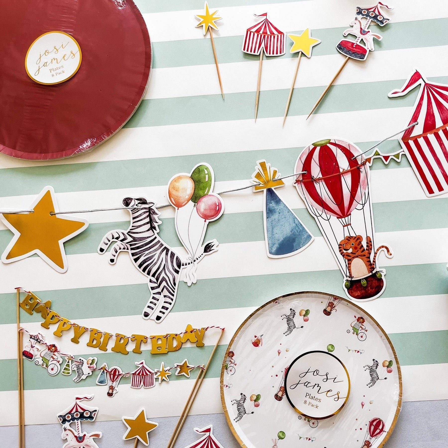 Fun and whimsical birthday carnival collection! This cake banner comes with mini banner pieces on small string, fun circus characters like lions and zebras, a carousel, circus tent, hot air balloon, party hats and more! Beautiful and colorful paper party cake banner with gold foil accents.Pairs Perfectly with the Carnival Banner. Great on 6, 8, 9, 10 or 12 inch cakes!