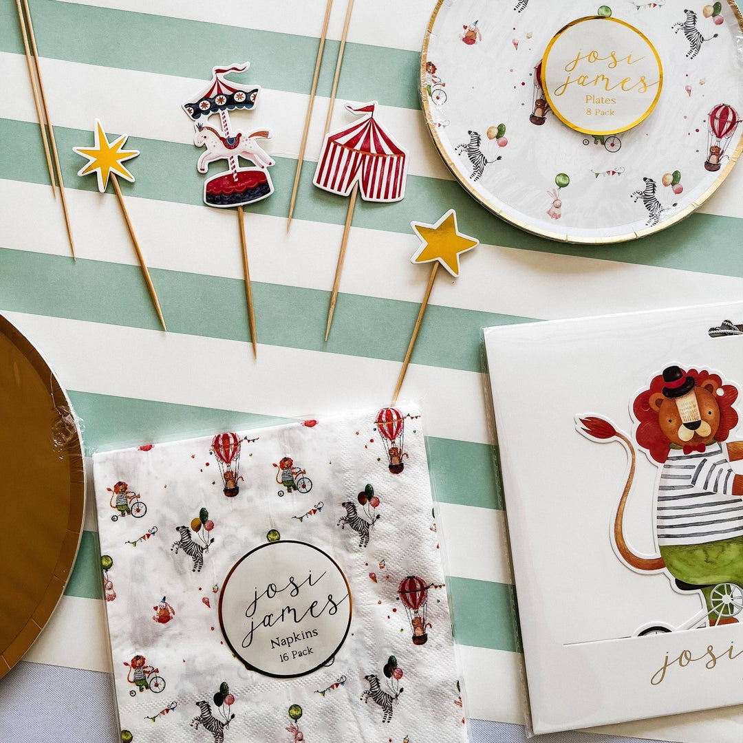 Includes: 2 gold foil stars, 3 carousel toppers, 3 circus tents
