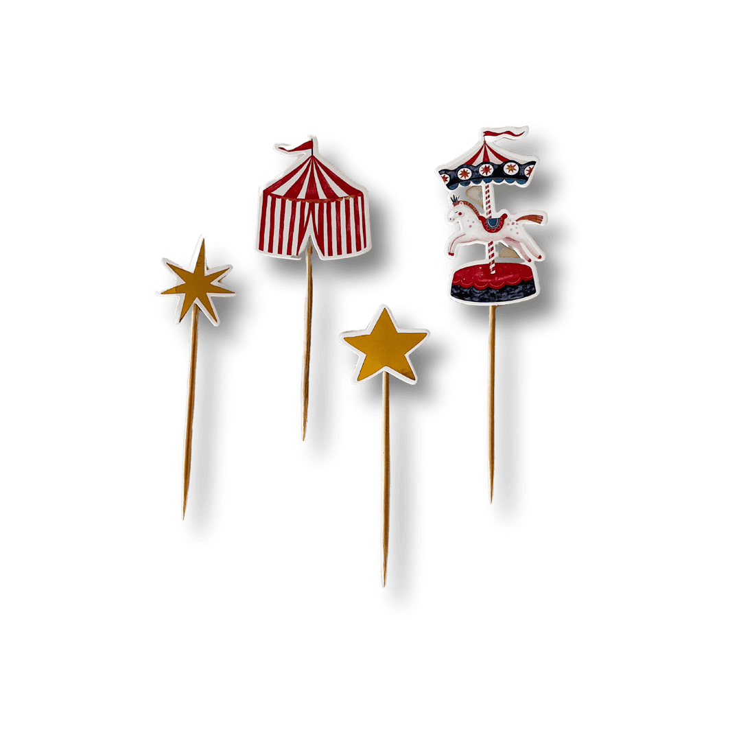 Our Carnival Cupcake Toppers (Set of 8) add a whimsical touch to your party desserts. This curated set features 2 sparkly gold foil stars, 3 cheerful carousel horses, and 3 classic red circus tents — each one full of nostalgic carnival magic. These sturdy toppers are pre-attached to food-safe sticks and ready to elevate cupcakes, brownies, or even donuts.