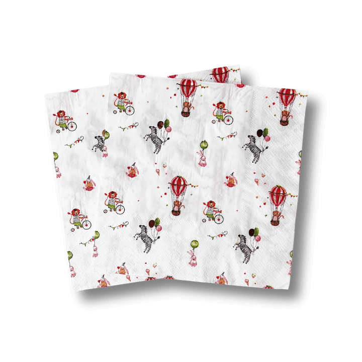 Our Carnival Lunch Napkins feature an adorable carnival-inspired pattern with charming circus icons and subtle gold foil accents that bring sparkle to your table. Each napkin is perfectly sized at 6.5 x 6.5 inches — ideal for meals, finger foods, and messy carnival treats.