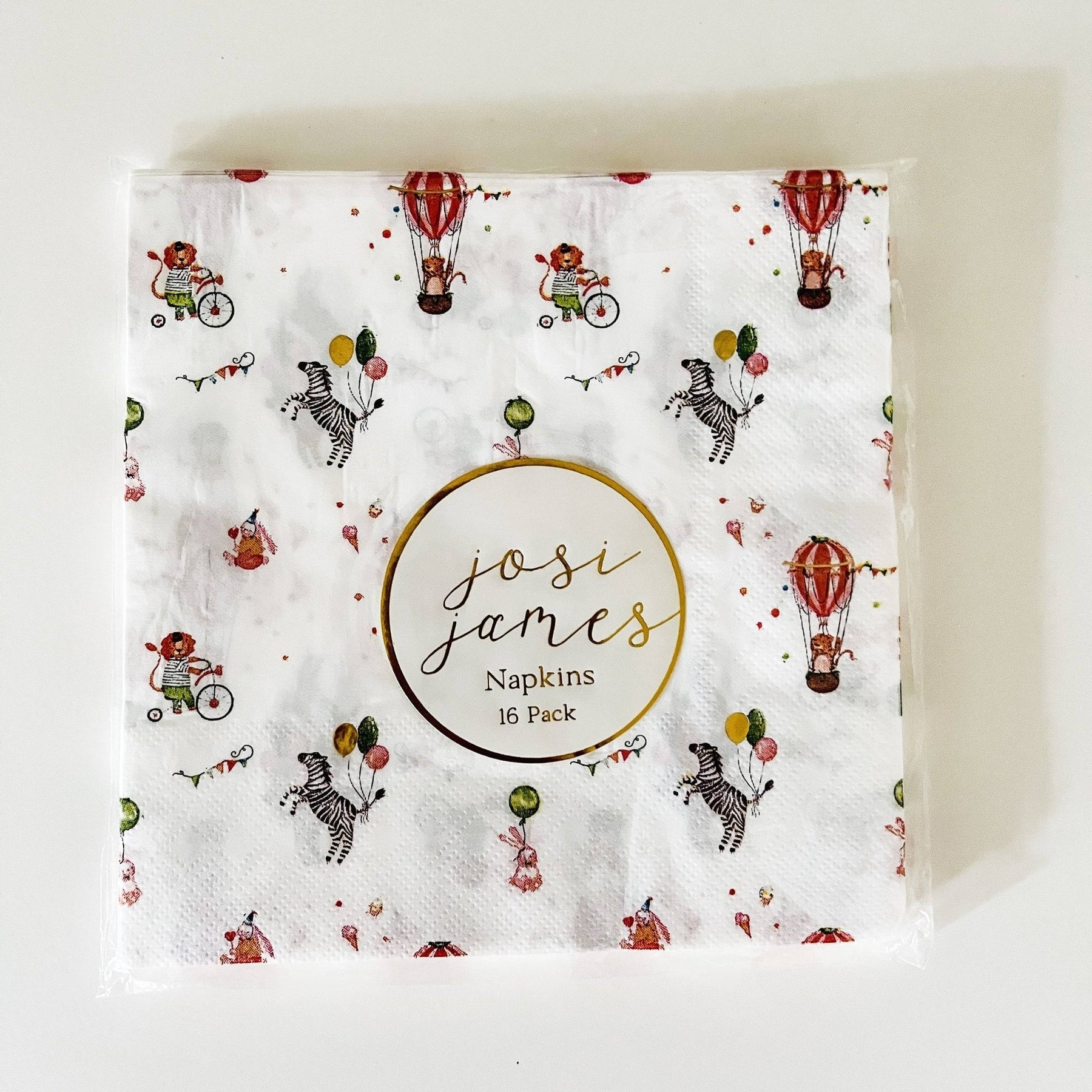 White 6.5x6.5 inch birthday carnival patterned lunch napkins. Sweet circus animals, gold foil accents, adorable carnival birthday designs, balloons, stars, and more in these bright and beautiful disposable paper carnival birthday party napkins. Set of 16 napkins.