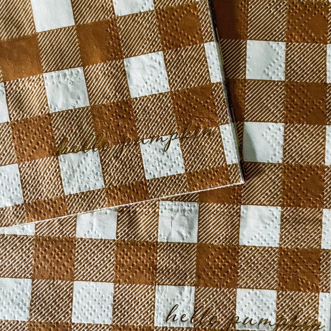 Adorable autumn orange plaid cocktail napkins with gold foil, "Hello Pumpkin". Burnt orange color plaid with cream, perfect for all your fall celebrations, Thanksgiving cocktail napkin, fall happy hour, baby shower, birthdays and more!