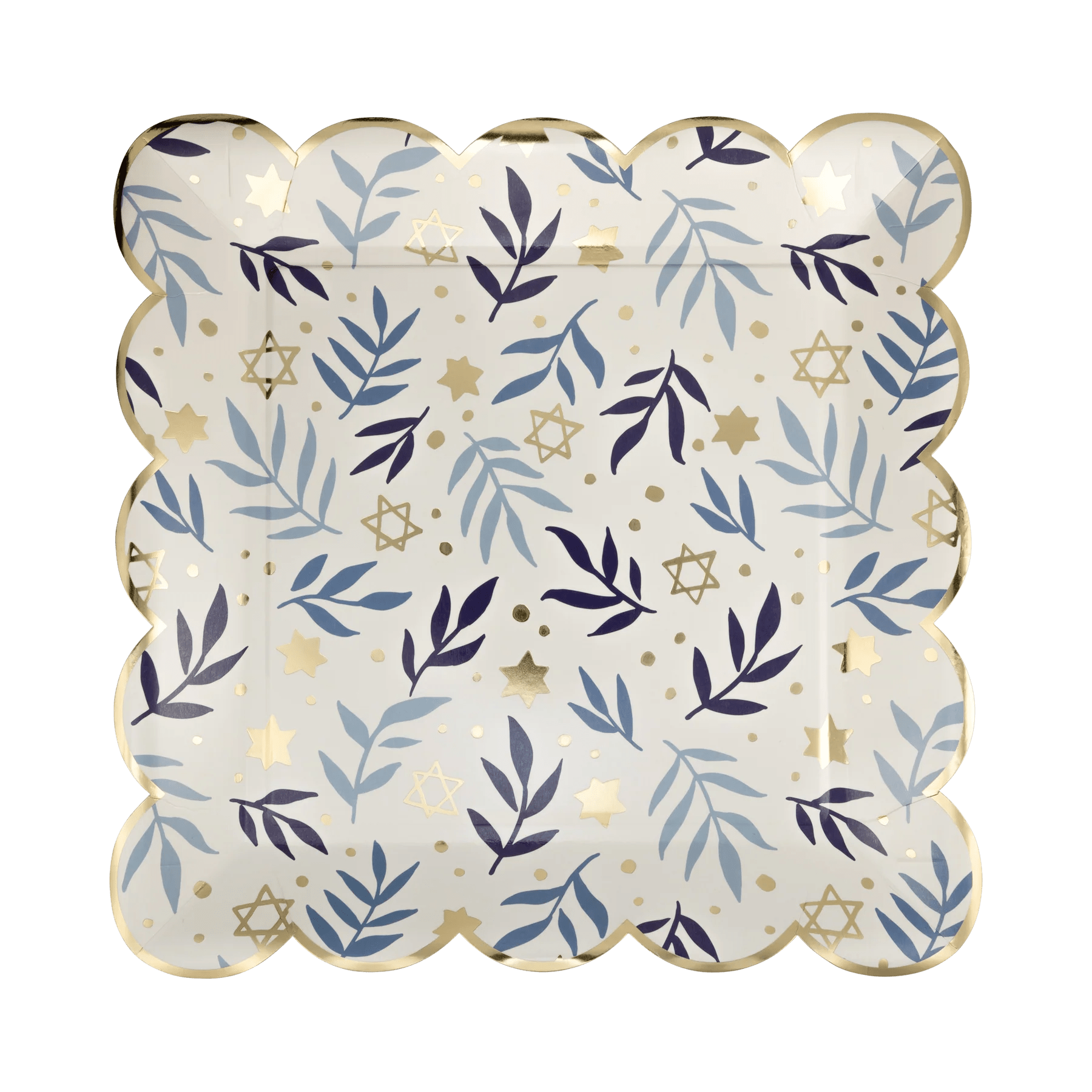Celebrate Hanukkah with these charming scalloped square plates, featuring festive star and branch patterns with gold foil detail. A beautiful touch for your table.