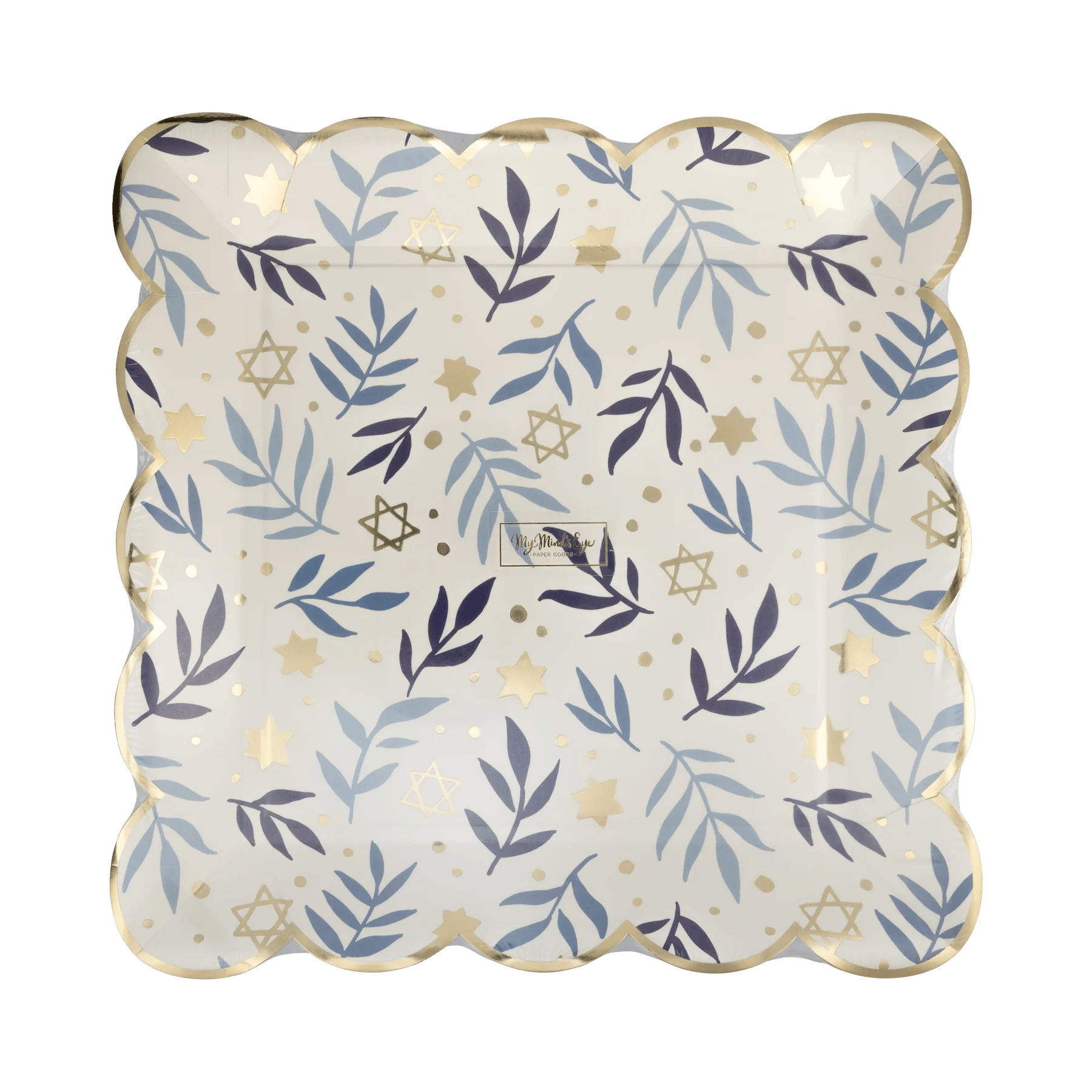 Hanukkah Stars & Branches Scalloped Square Plate – 10" Gold Foil (8ct) - Josi James - 10 Inch Plate