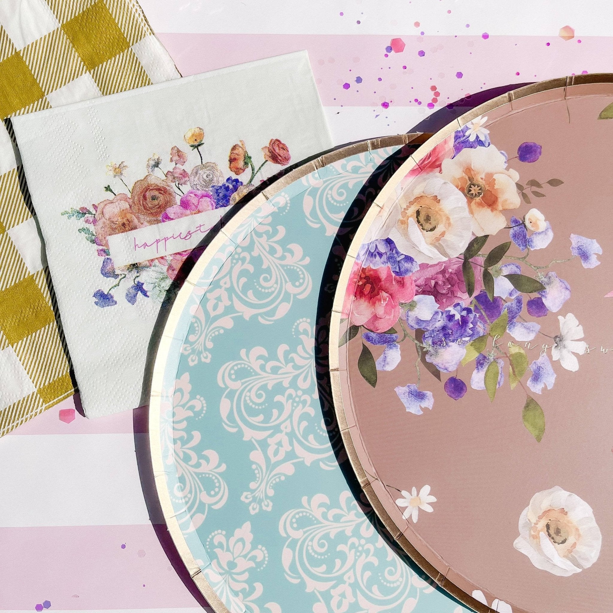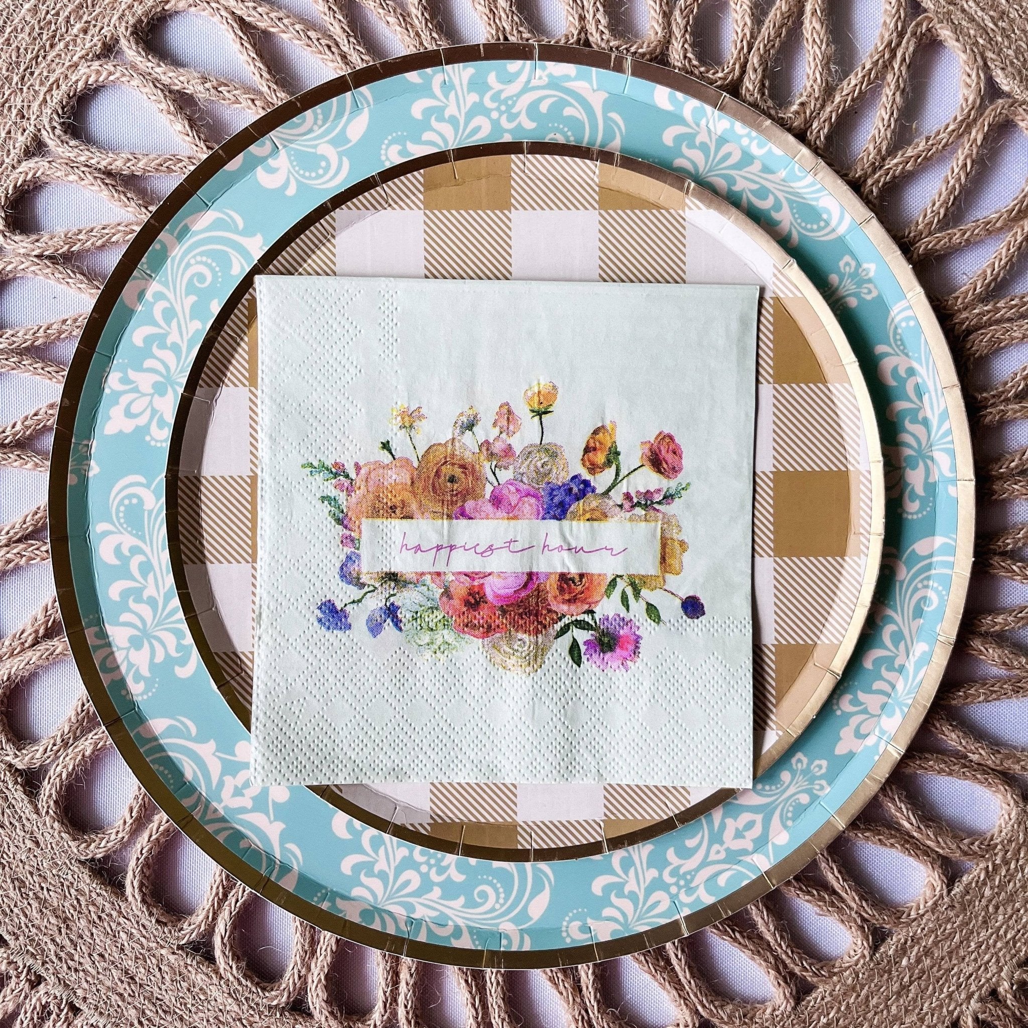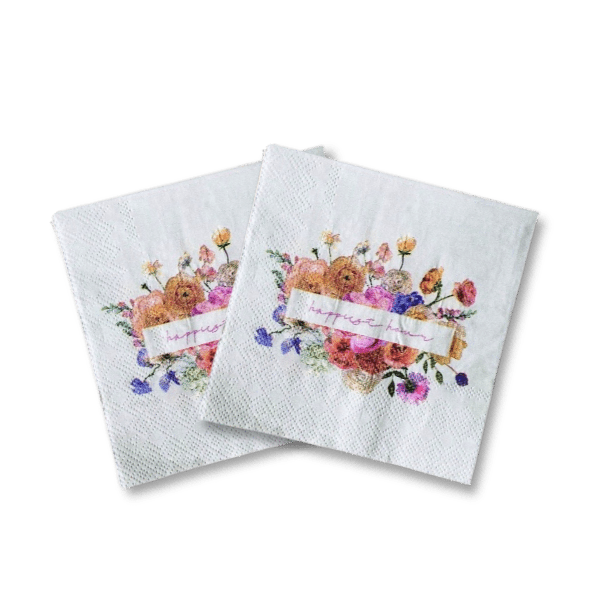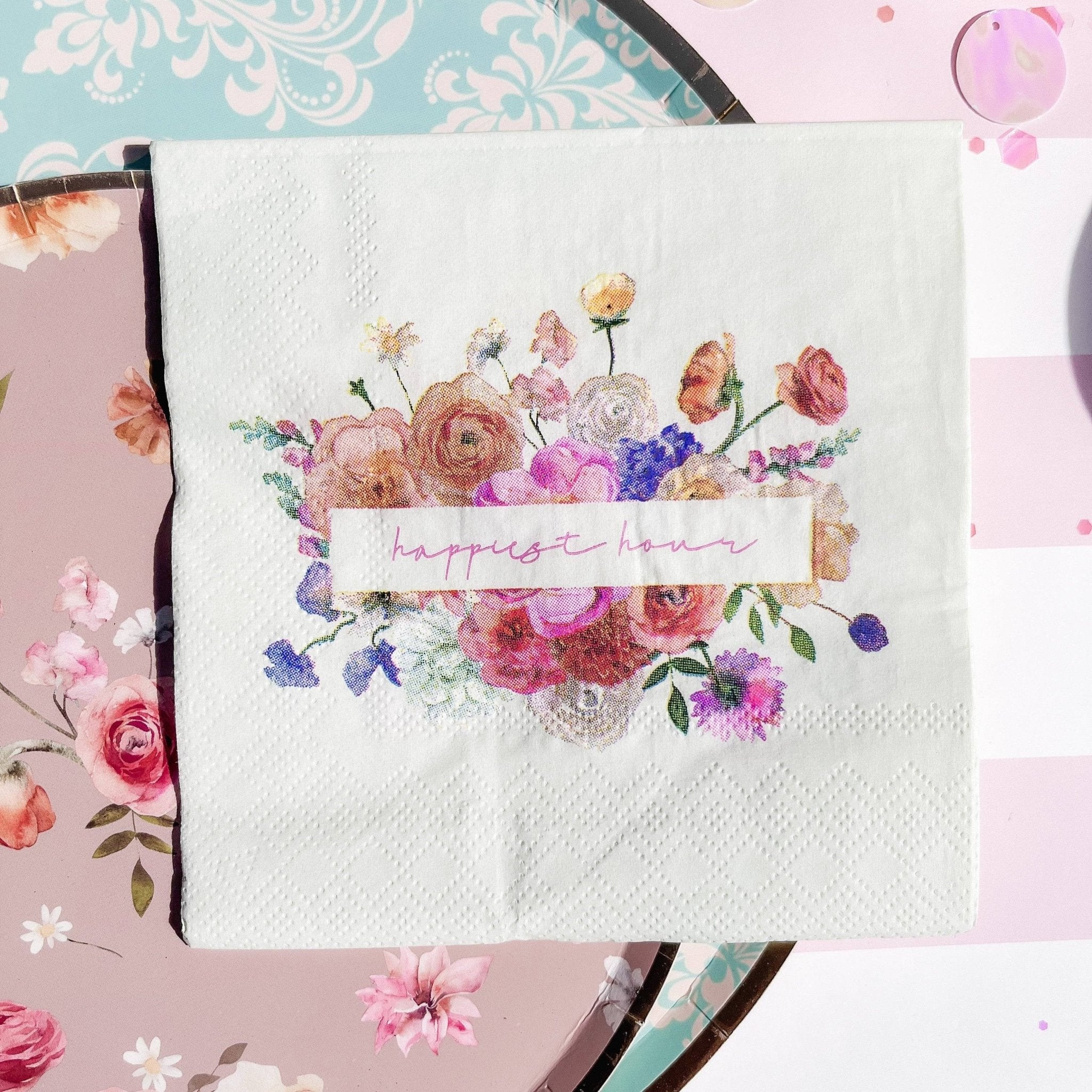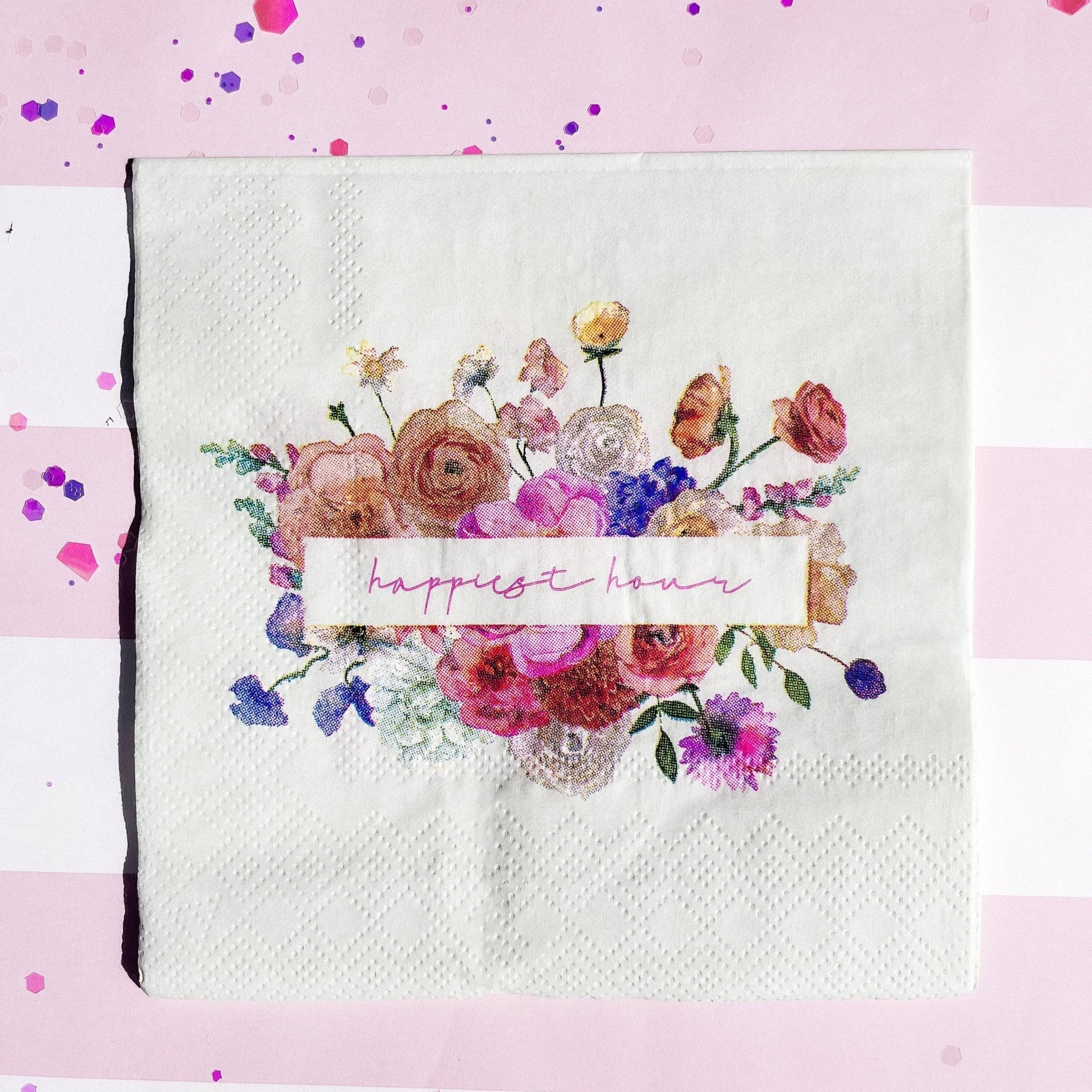 White Happy Hour floral, bright cocktail napkins. Slightly off white background, bright pink, orange, yellow, and purple flowers with pink script in the center that says "Happiest Hour". These stunning napkins are a perfect touch for your next happy hour, pool day, or summer get together.