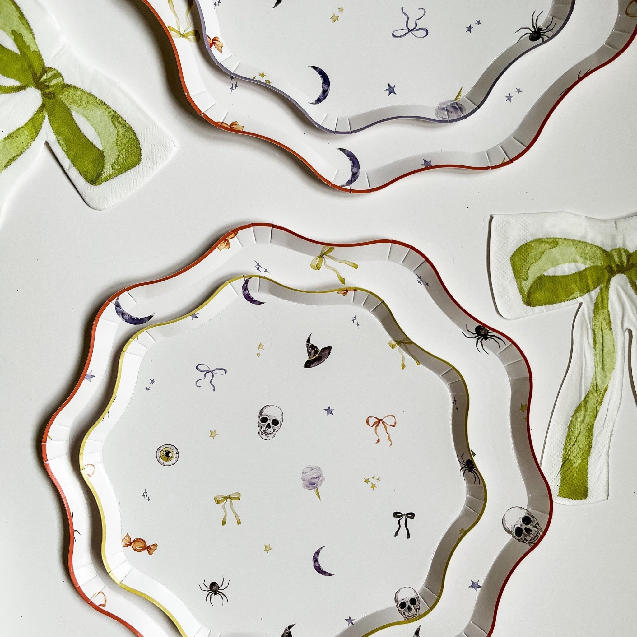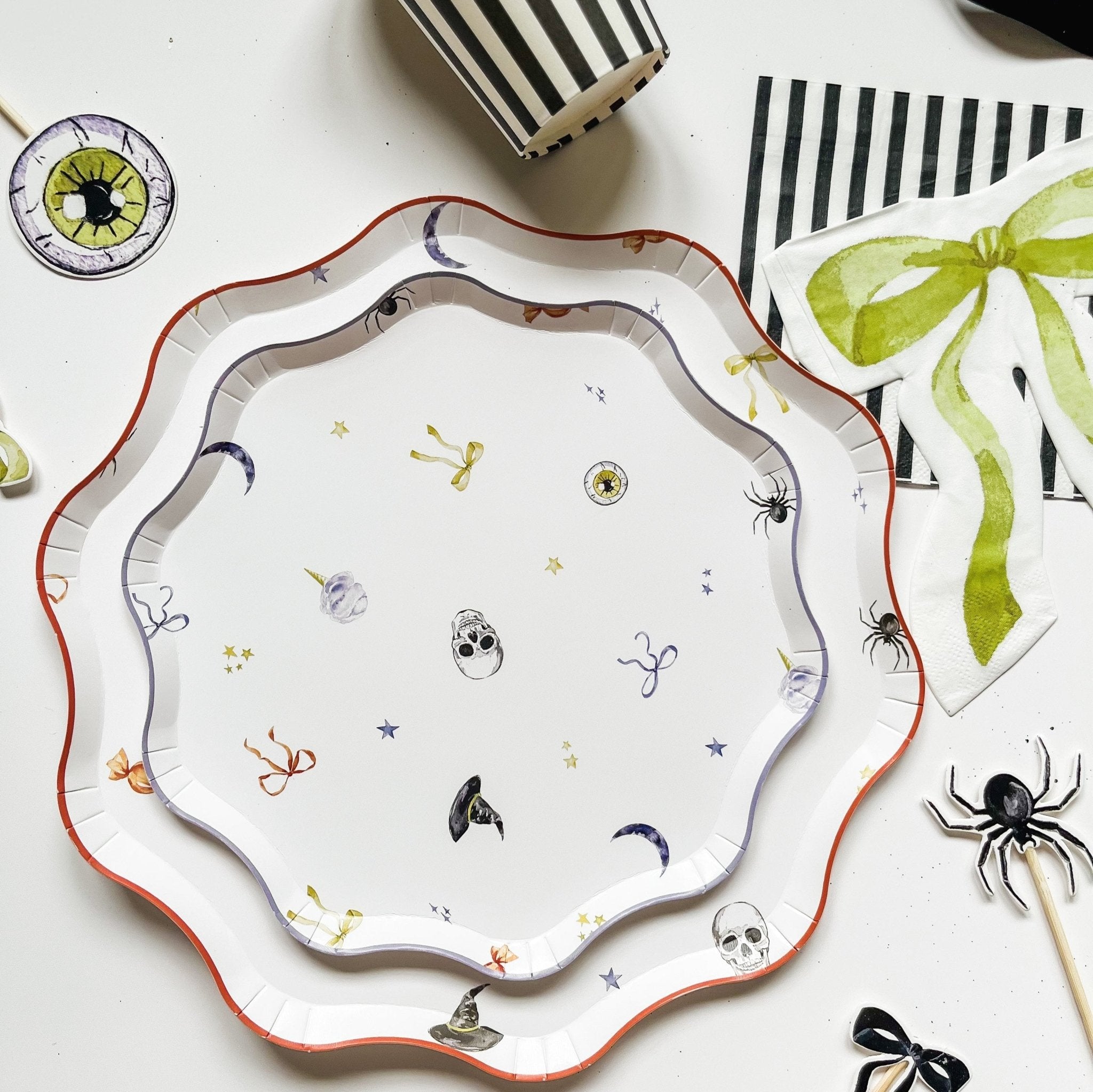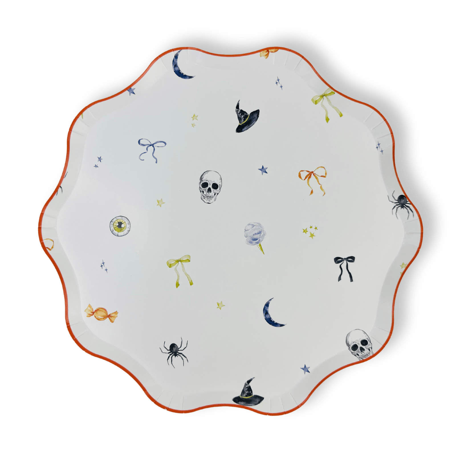 Spook up your Halloween party with our 12pcs Halloween Patterned Paper Party Plates! Each 10.5-inch plate showcases cute watercolor patterns of bows, skeletons, witches hats, and spiders, accented with an orange trim. Made of durable paper, these plates are ideal for serving treats and snacks at your gatherings. Bring a touch of festive fun to your table with these charming themed plates.
