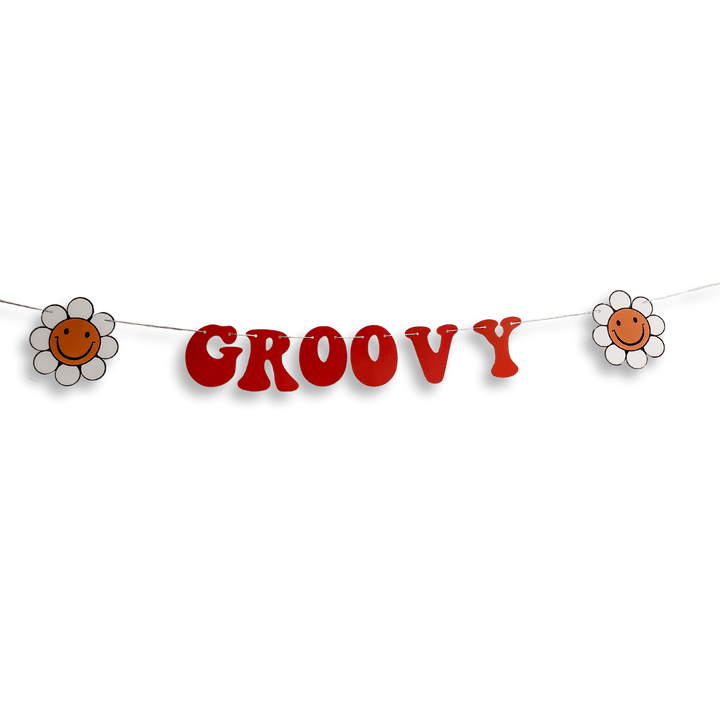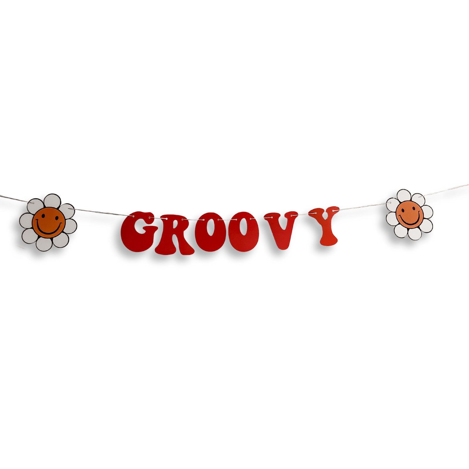 Adorable bannière Groovy parfaite pour les enterrements de vie de jeune fille, une célébration rétro ou hippie, ou bien d'autres encore ! La ficelle mesure 8 pieds de long, avec des lettres GROOVY et deux visages souriants, l'accent parfait pour votre célébration psychédélique.