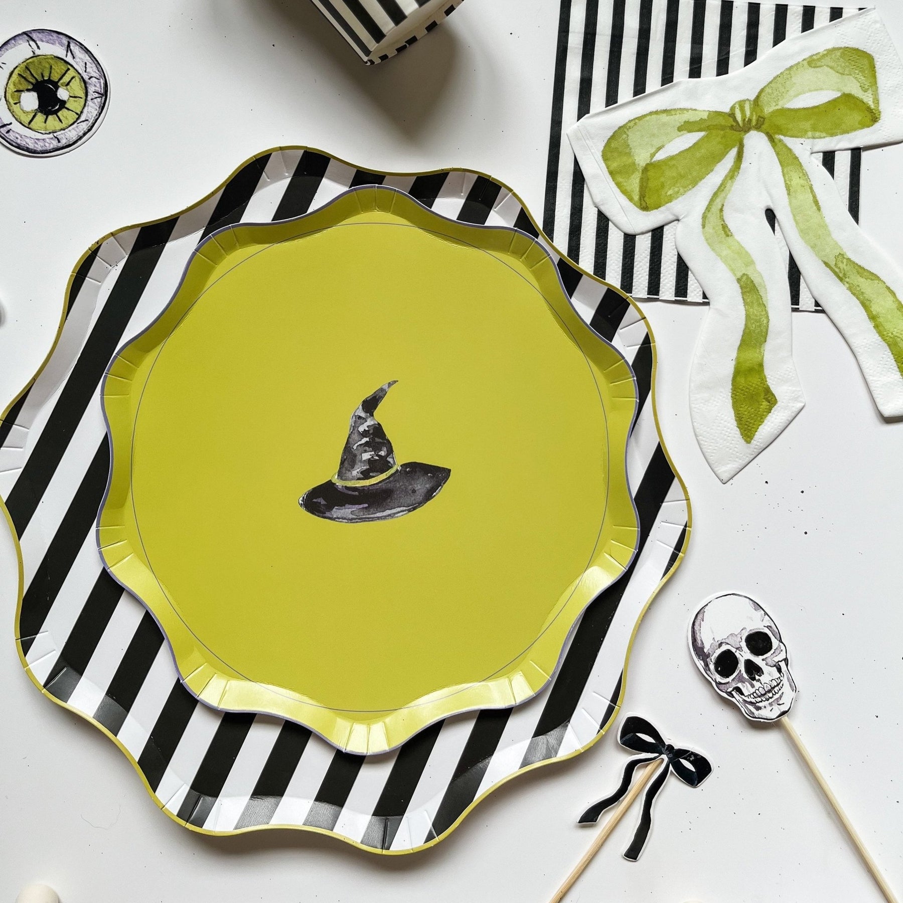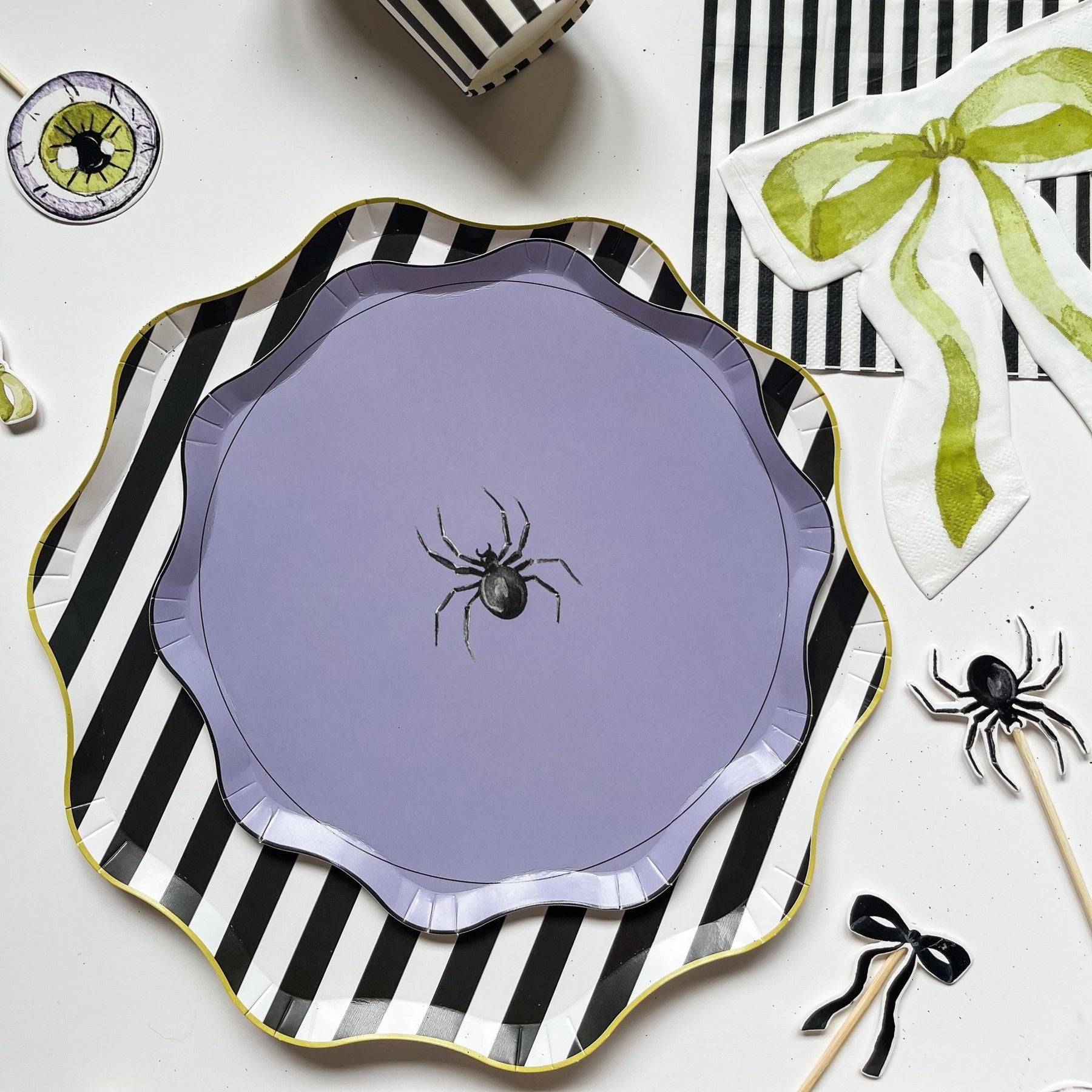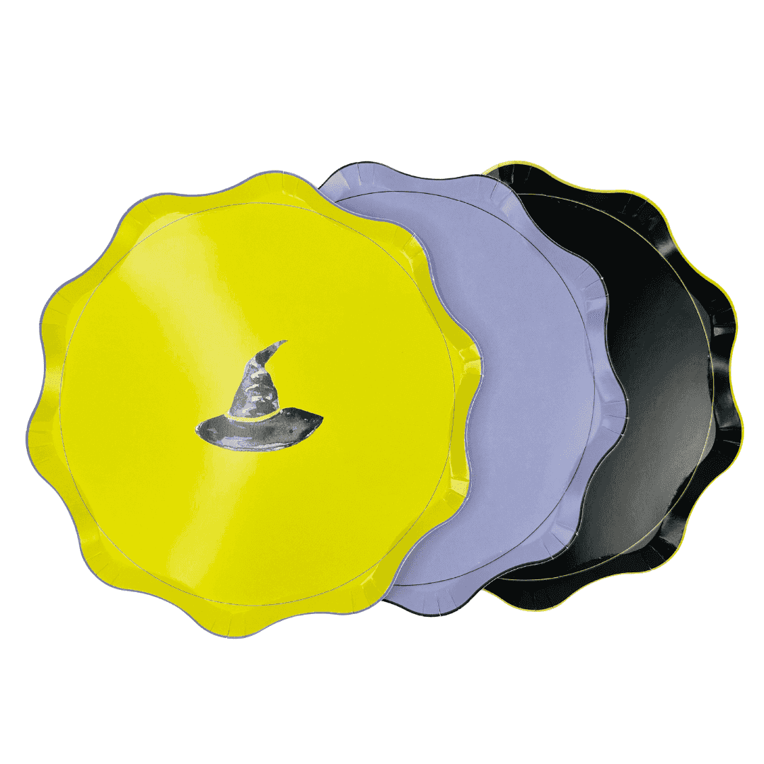 Add a touch of whimsy to your Halloween celebrations with these Halloween dessert plates. The set includes adorable ruffled designs: 4 black plates with chartreuse trim and a skeleton motif, 4 purple plates with ruffled black spider accents, and 4 chartreuse plates with purple trim and a witch's hat. Each plate measures 8.5 inches, perfect for serving desserts and treats. Made from sturdy material, these plates are both fun and functional, making your Halloween party memorable.