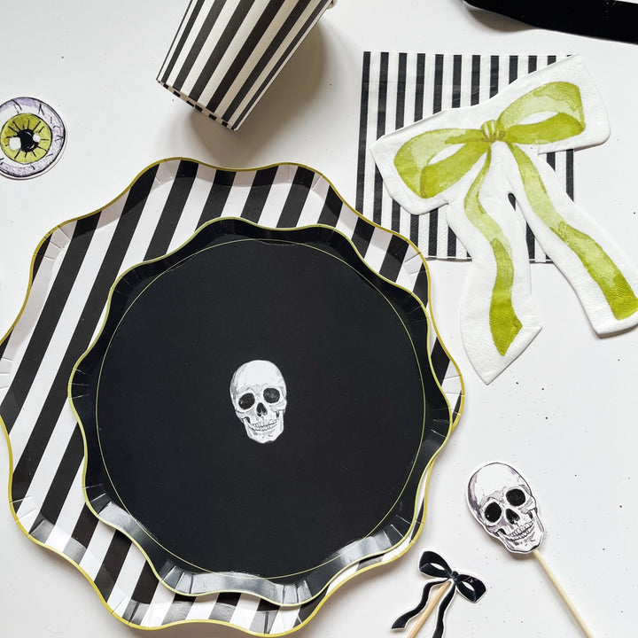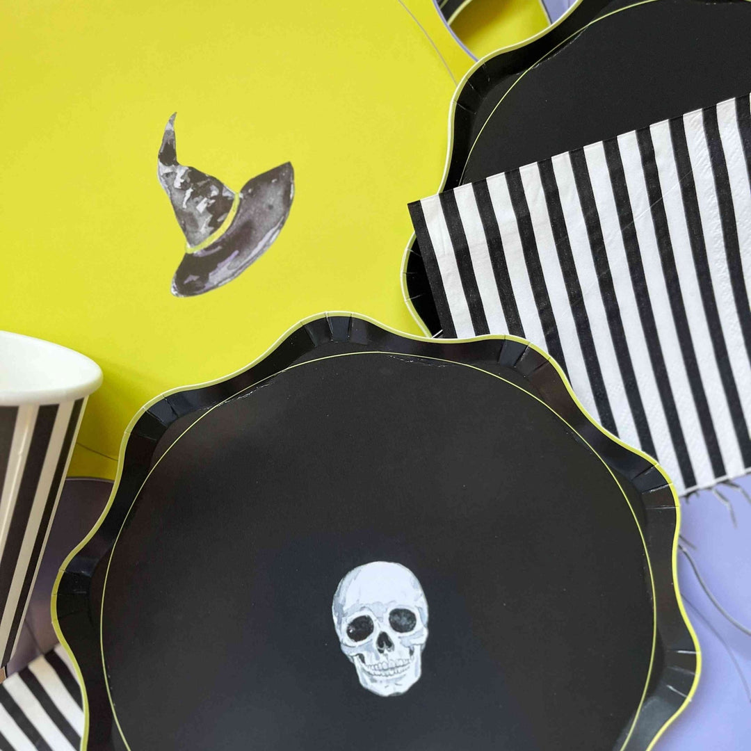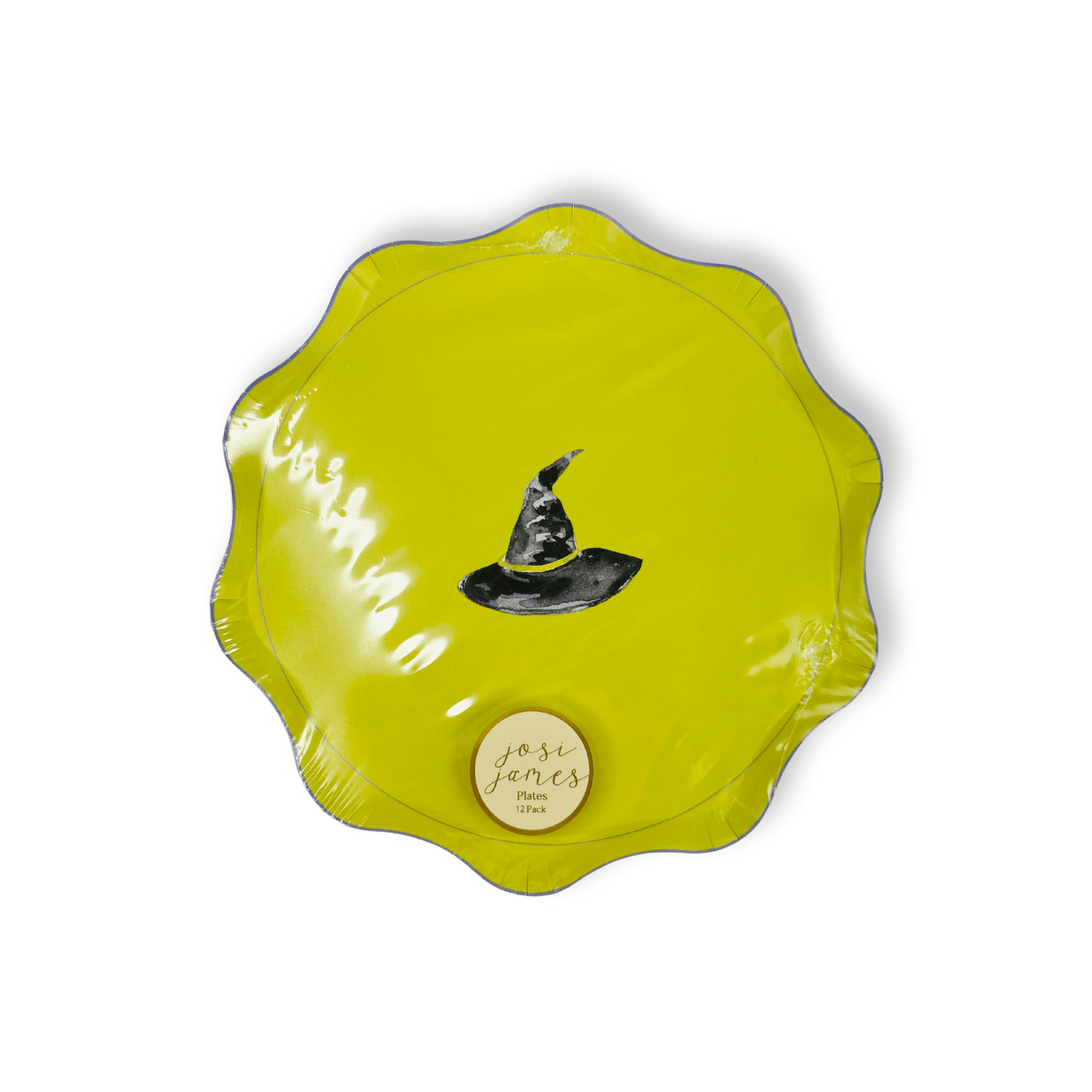 Add a touch of whimsy to your Halloween celebrations with these Halloween dessert plates. The set includes adorable ruffled designs: 4 black plates with chartreuse trim and a skeleton motif, 4 purple plates with ruffled black spider accents, and 4 chartreuse plates with purple trim and a witch's hat. Each plate measures 8.5 inches, perfect for serving desserts and treats. Made from sturdy material, these plates are both fun and functional, making your Halloween party memorable.
