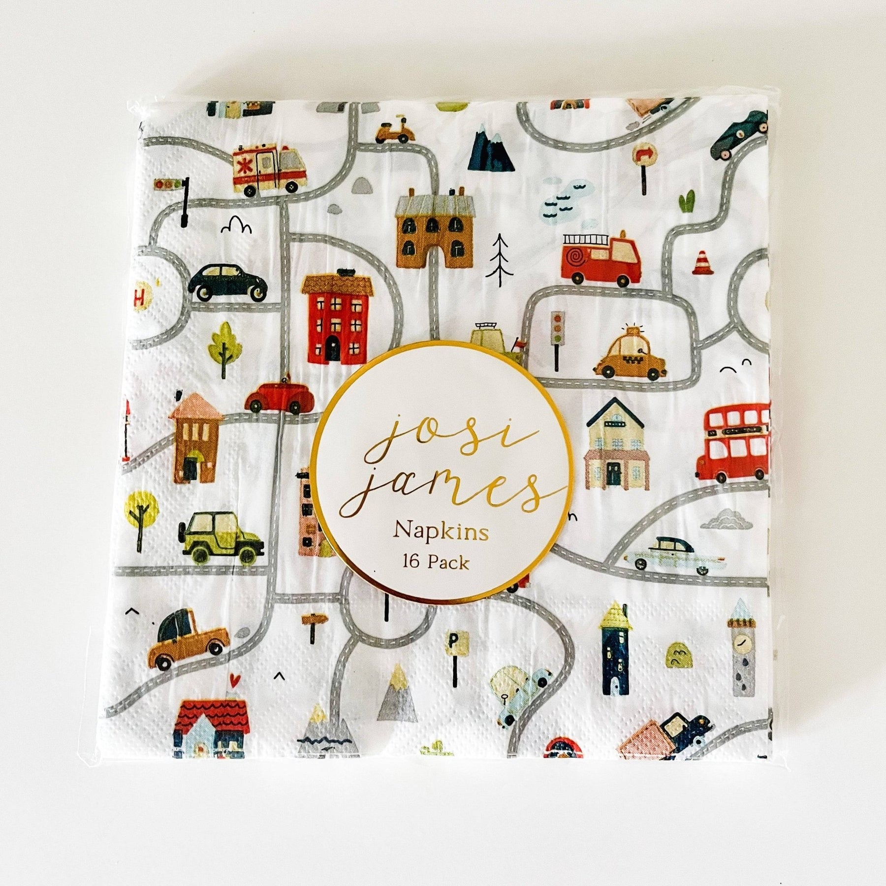 Large White Transportation Napkins, with Cars, Fire trucks, Buses, Taxis, Ambulance, and all the modes of roadside transportation for your Vroom Vroom or Beep Beep Party, Garbage Truck or a Vintage Car Party! The perfect Automobile Paper Party Napkins.
