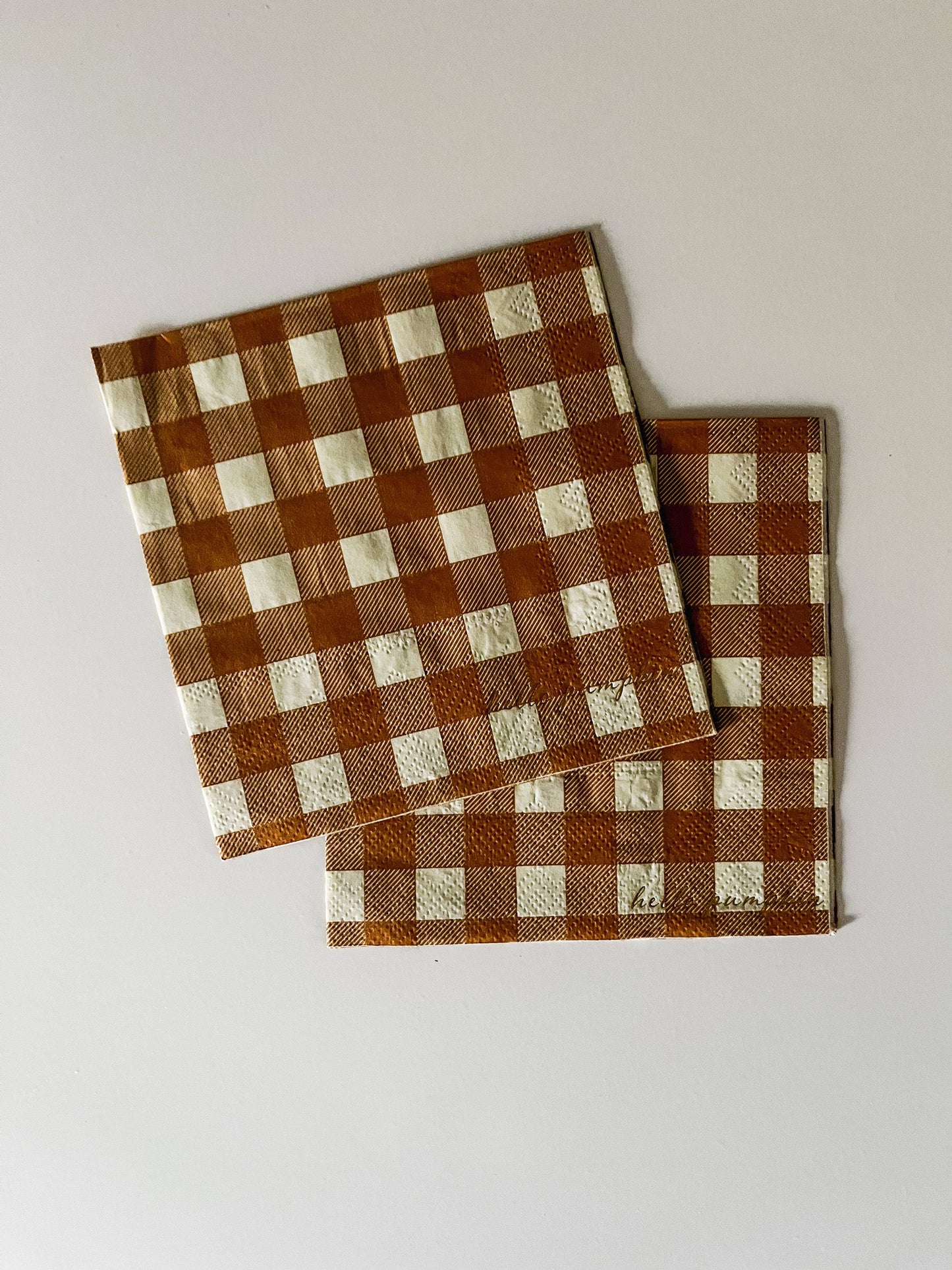 Adorable autumn orange plaid cocktail napkins with gold foil, "Hello Pumpkin". Burnt orange color plaid with cream, perfect for all your fall celebrations, Thanksgiving cocktail napkin, fall happy hour, baby shower, birthdays and more!