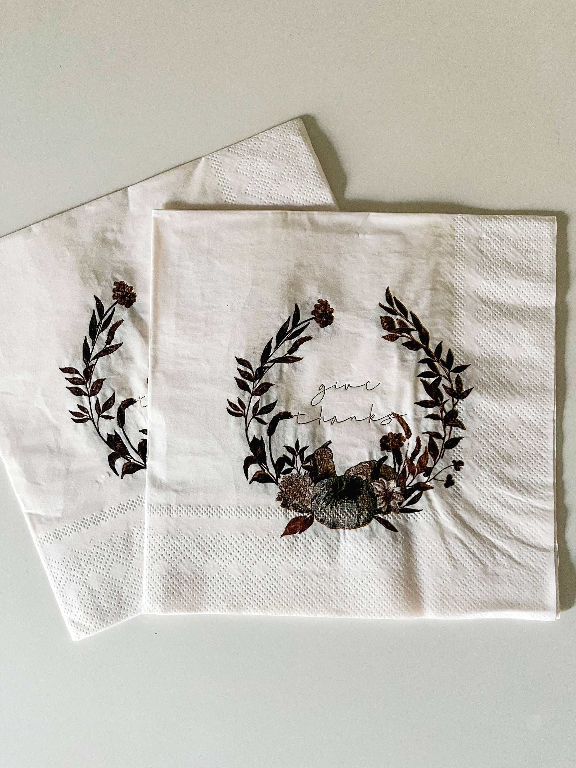 Cream, pumpkin dinner napkins with fall floral, stunning watercolor pumpkins, gold foil "give thanks" script.