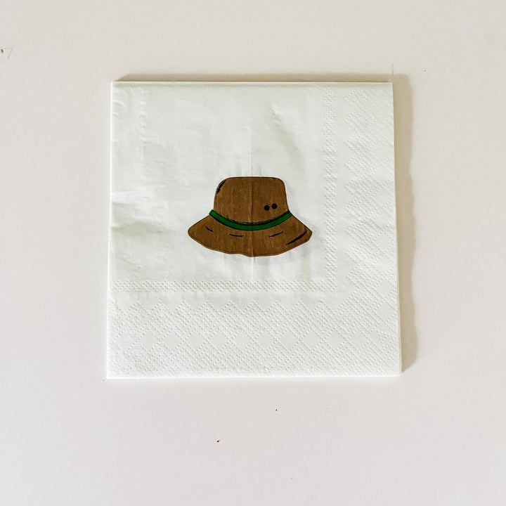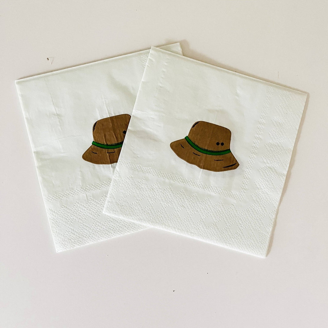 Fishing Bucket Hat small cocktail napkins, brown bucket hat with dark green accent. These are the cutest outdoor adventure, camping, or fishing themed birthday party napkin. Great cocktail napkin for Father's Day or any children's birthday, comes in a set of 16 napkins that are 5 x 5 inches.
